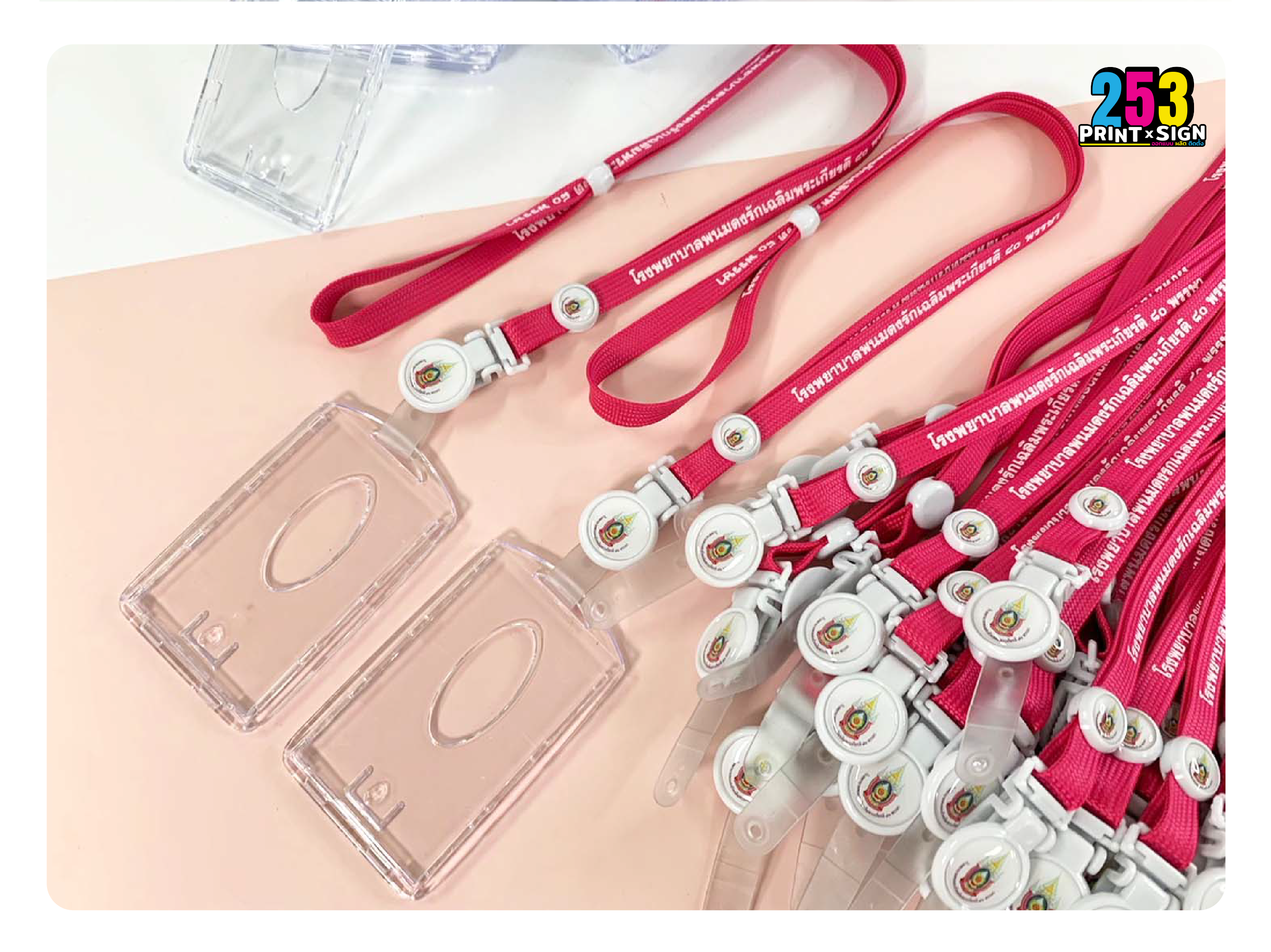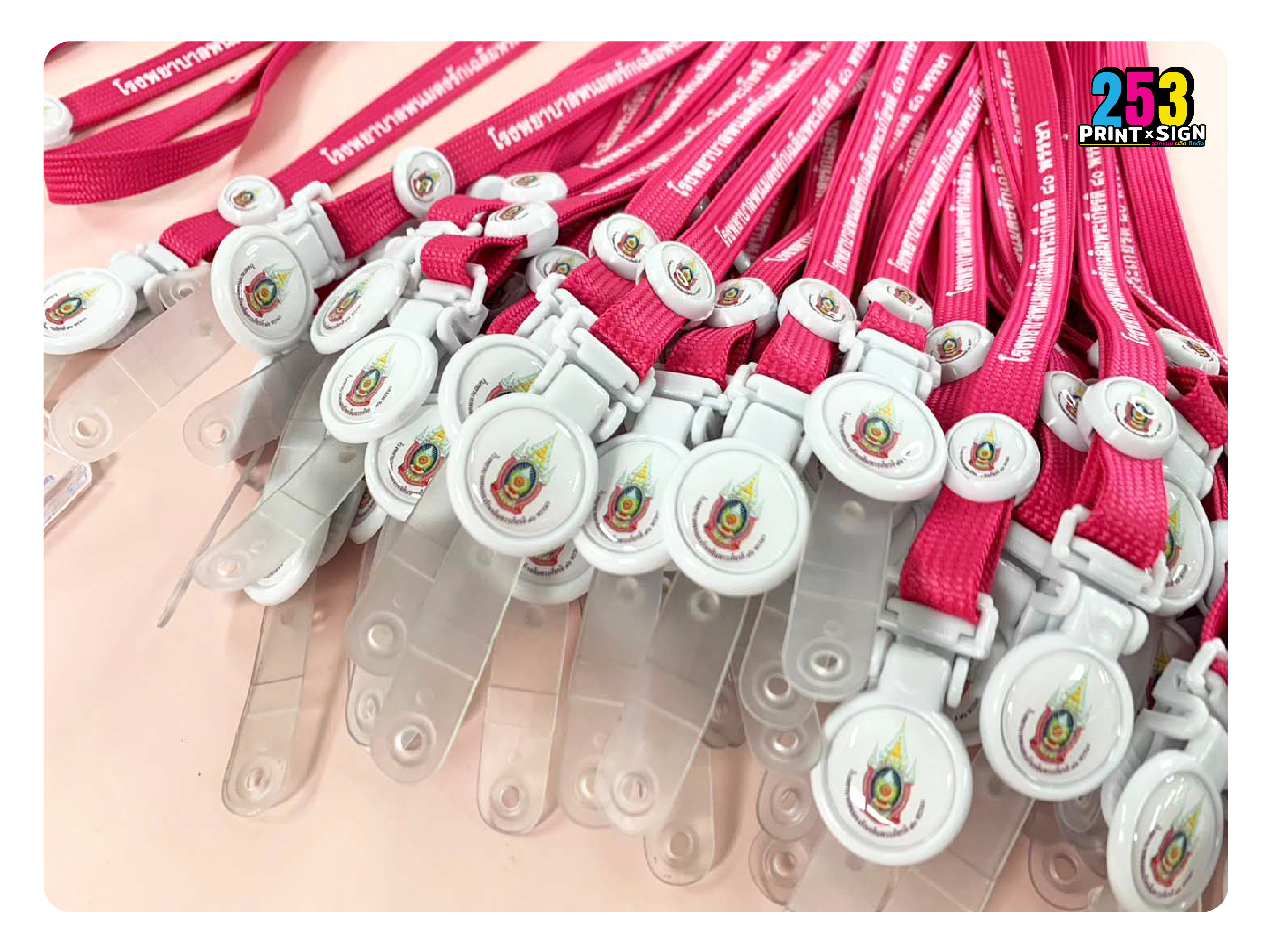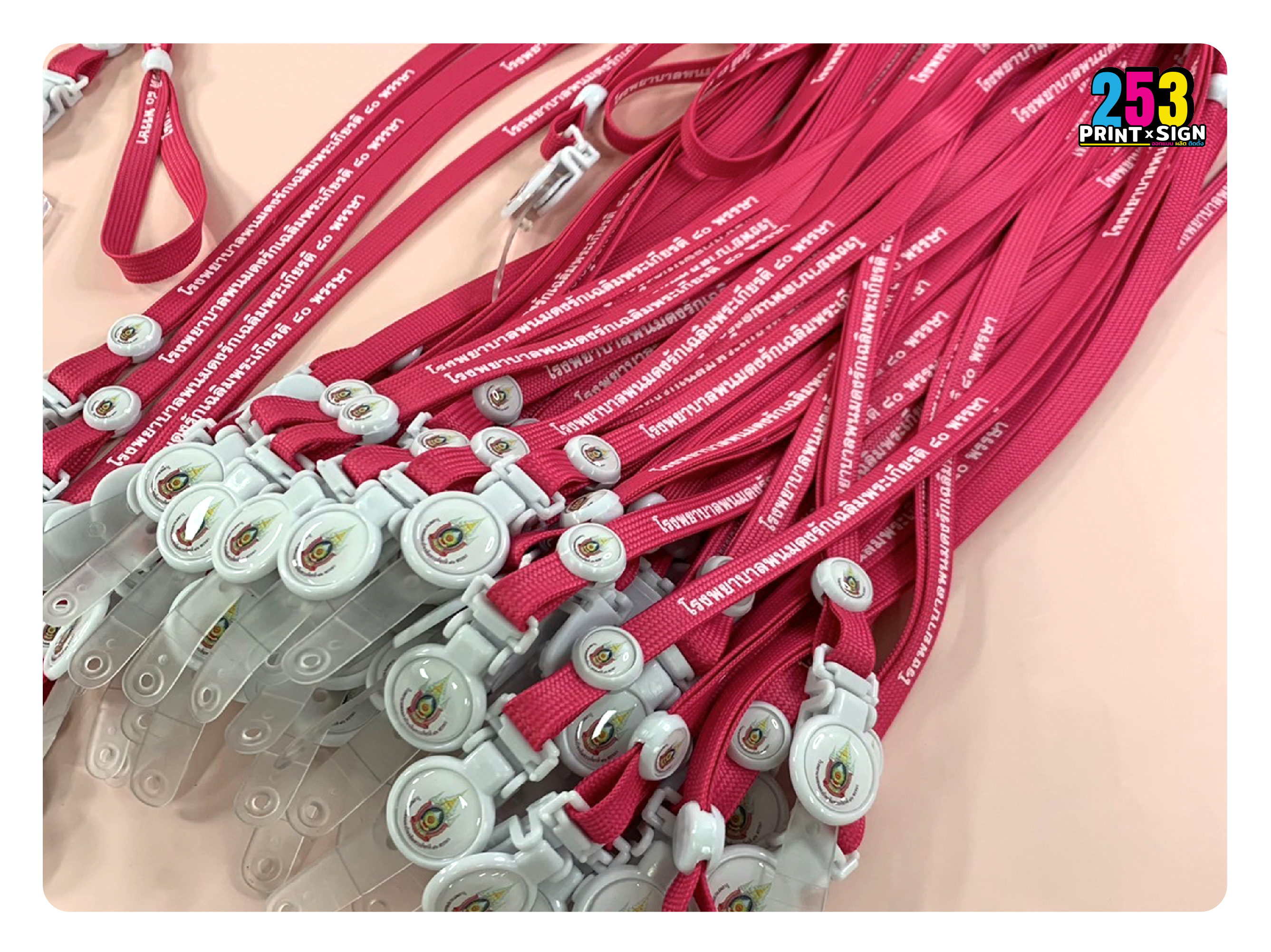 รับออกแบบ พร้อมสั่งผลิต สายคล้องคอ สายห้อยคอ สายห้อยบัตร สายคล้องบัตรประจำตัวพนักงาน สายคล้องเหรียญรางวัล งานวิ่งแข่ง สายคล้องบัตรนักเรียน นักศึกษา สายคล้องมือ สายคล้องโทรศัพท์ สายคล้องแมส สายคล้องหน้ากากอนามัยพร้อมสกรีนโลโก้ สามารถเลือกอุปกรณ์ห้อยบัตรตามแบบที่ต้องการได้